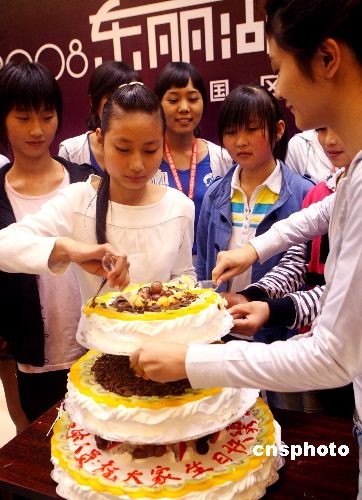 圖為在天津上學(xué)的甘肅地震災(zāi)區(qū)學(xué)生與參賽佳麗一起慶賀生日。中新社發(fā) 錢興強(qiáng) 攝