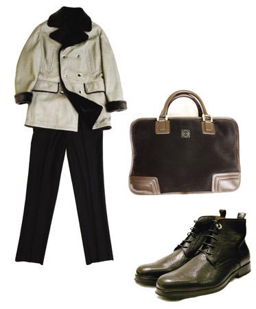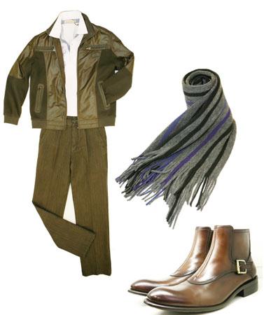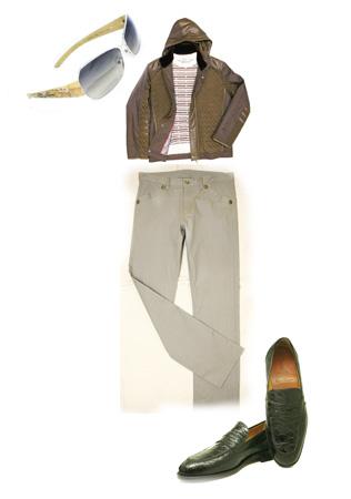 “皮”氣致搭:深栗色亞光帶帽夾克衫+法蘭絨帶褶長褲+斜紋真絲方巾+鱷魚皮鞋
