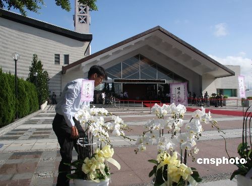 臺(tái)塑企業(yè)創(chuàng)辦人王永慶的遺體十七日由長(zhǎng)榮班機(jī)運(yùn)抵臺(tái)灣,靈堂設(shè)在桃園縣的長(zhǎng)庚大學(xué)活動(dòng)中心。圖為靈堂外景。中新社發(fā) 耿軍 攝