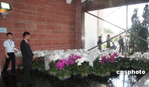 臺(tái)塑企業(yè)創(chuàng)辦人王永慶的遺體十七日由長榮班機(jī)運(yùn)抵臺(tái)灣,靈堂設(shè)在桃園縣的長庚大學(xué)活動(dòng)中心。圖為大批潔白的蝴蝶蘭鮮花運(yùn)抵靈堂。從十八日上午開始,靈堂開放各界吊唁。中新社發(fā) 耿軍 攝