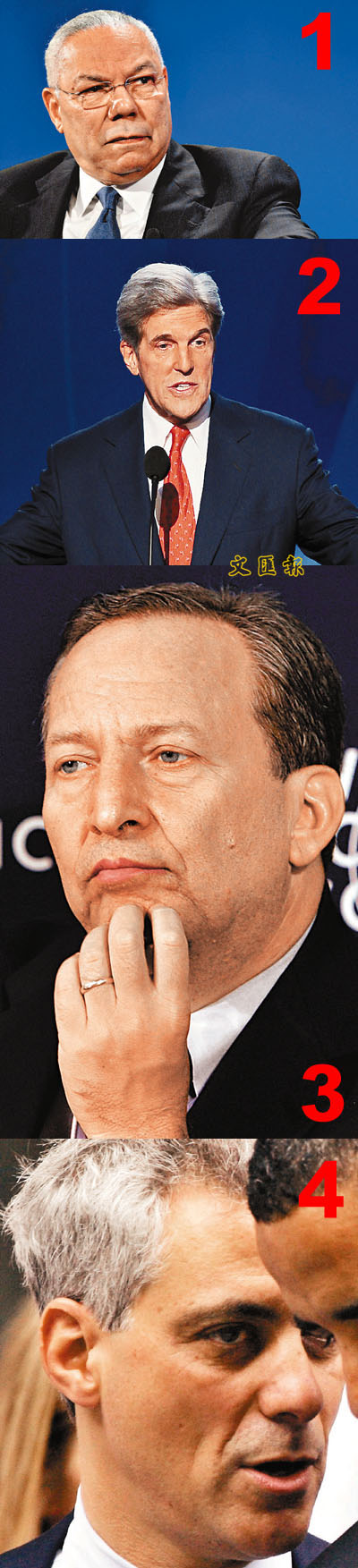 傳聞內(nèi)閣人選:1. 國務(wù)卿:麻省參議員克里(上屆大選角逐總統(tǒng)落敗) ;2. 國防部長:前布什政府國務(wù)卿鮑威爾; 3. 財長:前哈佛大學(xué)校長薩默斯(曾任克林頓政府財長) ;4. 白宮幕僚長:伊利諾伊州眾議員伊曼紐爾(曾為民主黨奪得眾院大多數(shù)立下汗馬功勞)