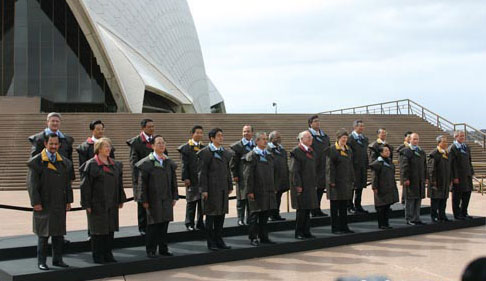 2007年悉尼APEC峰會的各領(lǐng)袖會穿什么“民族服裝”,主辦方一直保持高度神秘。直到各領(lǐng)袖在世界媒體前亮相之時才揭曉:原來澳洲選擇了深褐色的皮夾克,樣子很容易使人聯(lián)想到厚重的雨衣!