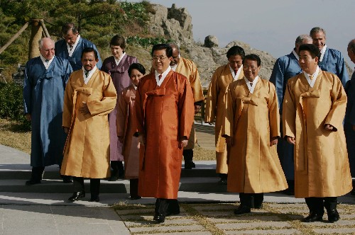 資料圖片:2005年11月19日,國家主席胡錦濤出席亞太經(jīng)合組織第十三次領(lǐng)導人非正式會議。圖為胡錦濤主席等亞太經(jīng)合組織成員的領(lǐng)導人身著韓國民族特色的服裝“圖魯馬吉”合影后,前往出席《亞太經(jīng)濟合作組織第十三次領(lǐng)導人非正式會議釜山宣言》的宣讀儀式。樊如鈞 攝