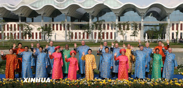 2006年11月19日,亞太經(jīng)合組織各成員領(lǐng)導人身穿越式傳統(tǒng)服裝,集體在越南首都河內(nèi)國家會議中心西島合影留念。 新華社記者 樊如鈞 攝
