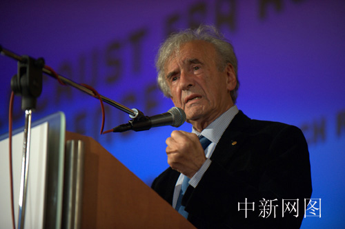 圖:諾貝爾和平獎(jiǎng)獲得者、美國(guó)作家伊利.威塞爾發(fā)表演講(攝影:黃頻)