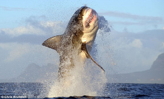 在攝影師Chris Brunskill的鏡頭中,大白鯊雖然體形碩大,捕食時(shí)卻身手矯健,縱身躍出水面6米高,張開大嘴將它的“美食”緊緊咬在口中。