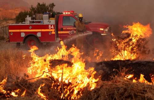 由于持續(xù)高溫干熱,從上周開(kāi)始,洛杉磯北部山區(qū)接連爆發(fā)山火,盡管數(shù)千名消防員和滅火飛機(jī)奮力撲火,但火勢(shì)迅速蔓延,至今主要火區(qū)的山火只有百分之五得到控制。記者看到,山火引發(fā)的濃煙彌漫在洛杉磯北部上空,東西長(zhǎng)達(dá)十幾公里,蘑菇狀濃煙高聳入云。