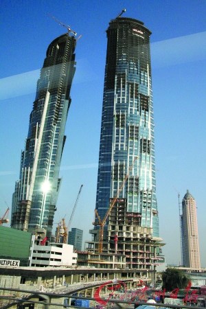 Burj Dubai可謂是樓市繁榮的見證,它簡(jiǎn)直就是個(gè)大工地。各式摩天大樓爭(zhēng)奇斗艷,有的像雙子塔、有的像要騰空的火箭。連同高聳入云的迪拜塔,它們都有一個(gè)共同點(diǎn):全部未對(duì)外開放,現(xiàn)場(chǎng)看不到施工者,大樓上的起重機(jī)也被晾曬在一邊。