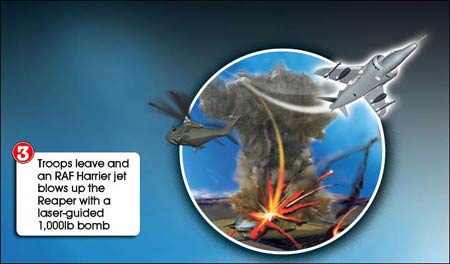 之后,隊(duì)員們沿繩索攀爬回直升機(jī),并用激光制導(dǎo)炸彈將偵察機(jī)引爆。