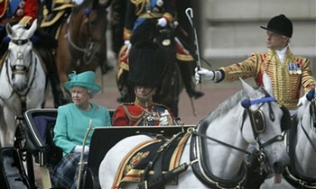 據(jù)英國廣播公司報道,按照傳統(tǒng),女王夫婦搭乘開敞篷馬車抵達(dá)白金漢宮邊上的馬隊(duì)校閱場。王儲查爾斯王子和安妮公主則率馬隊(duì)跟隨。