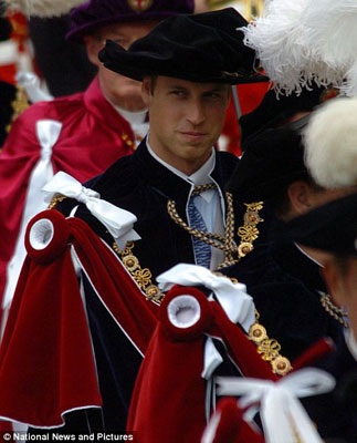 身穿騎士套裝的威廉王子看起來非常引人注目,當他與父親、祖父以及其他騎士組成隊列走過時,他的眼睛始終緊盯地面,神色顯得稍微有些局促不安。