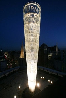 這座玻璃和鋼制成的圓錐形紀(jì)念碑位于英國廣播公司(BBC)大樓頂部,是在BBC的兩名記者早先分別在阿富汗和索馬里殉職后開始設(shè)立的。