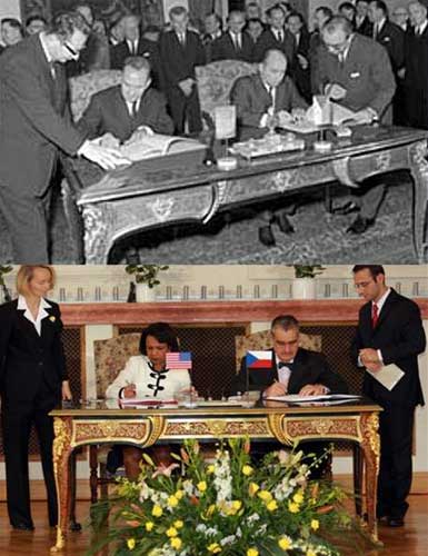 當(dāng)賴斯和施瓦岑貝格笑容可掬地站在那張金碧輝煌的雕花簽字桌旁沖著記者們的閃光燈舉起手里一紅一黑的協(xié)定時,他們還不知道在同一張簽名桌上40年前誕生過一個令捷克蒙受奇恥大辱的城下之盟。