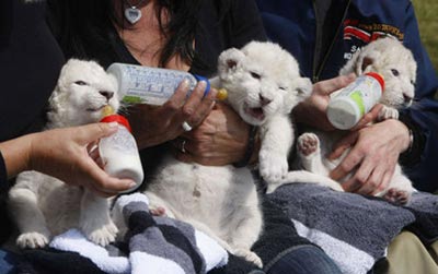 該動(dòng)物園的兩只母白獅6月30日同時(shí)產(chǎn)下總共7只小白獅。7只小白獅4只為雄性,3只為雌性。但是其中一只母獅拒絕喂養(yǎng)自己的4只小獅子,因而動(dòng)物園的管理員飼養(yǎng)了這些可愛(ài)的小家伙。