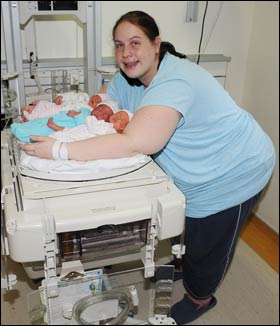 剖腹手術(shù)要做得特別精確小心,整個過程耗費不少人力,特制鋼質(zhì)手術(shù)臺需要5位助產(chǎn)士、4個外科醫(yī)生、4個麻醉師及12個嬰兒顧問和護士等,共68人助陣。她只能麻醉下半身,因全身麻醉可能致命;其胃部亦要提起,以騰出更多空間取出嬰兒。最后她順利誕下2名各重4磅多的女兒,和一名5磅多的兒子,當然這次重量級的生產(chǎn)也是耗資不菲,花了20萬英鎊,是正常費用的4倍。