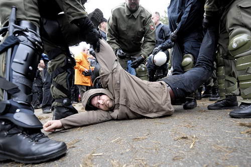 一位警方發(fā)言人稱,有1000多名反核示威者坐在位于小鎮(zhèn)戈萊本附近的存儲(chǔ)設(shè)施大門外,部署在那一地區(qū)的數(shù)千名防暴警察已將示威者逐個(gè)拖走。這些示威者是15000多名示威者中的一部分,示威者在上周末舉行了大規(guī)模的示威活動(dòng)以阻止核廢料抵達(dá)存儲(chǔ)設(shè)施。警方為了保證核廢料運(yùn)輸活動(dòng)的安全部署了16000名警員。