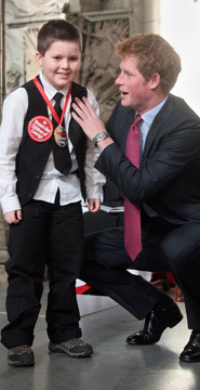 在頒獎(jiǎng)典禮上,24歲的哈里蹲下身擁抱每一個(gè)獲獎(jiǎng)兒童,給予他們充滿溫暖的問候和笑容。為了緩解孩子們的緊張,哈里一直用手輕拍他們的后背。他小心翼翼給一個(gè)小女孩戴上獎(jiǎng)牌唯恐碰到女孩頭發(fā),讓人實(shí)在無法想象他曾是一個(gè)醉醺醺出盡洋相的“混世魔王”。這位“愛心王子”的用心,讓每一個(gè)緊張的孩子露出可愛的笑臉。