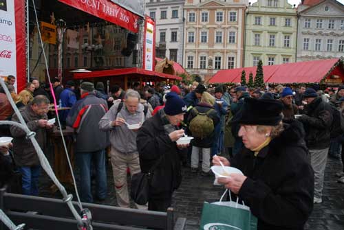 布拉格市政廳一如既往12月24日中午在市中心老城廣場(chǎng)向無(wú)家可歸的人免費(fèi)發(fā)放魚湯。