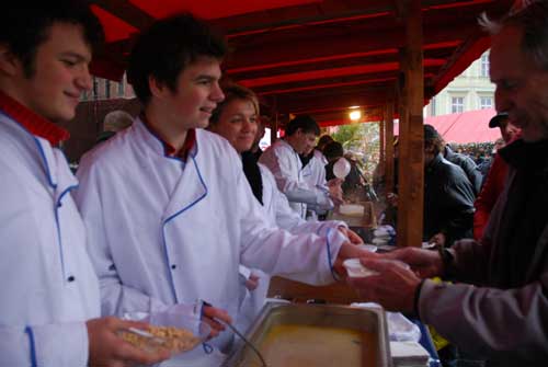6年來(lái)布拉格市長(zhǎng)貝姆第一次沒有親自操勺打湯,據(jù)說(shuō)這位跑過馬拉松,登過珠峰的運(yùn)動(dòng)愛好者人在南極,他的太太拉德米拉.貝娃帶著兩個(gè)兒子為市民服務(wù),向每一位領(lǐng)湯的人轉(zhuǎn)達(dá)她丈夫的節(jié)日問候。