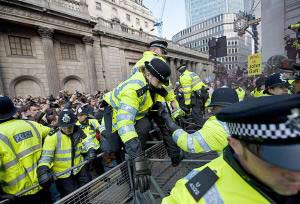 目前,有1200名示威者聚集在英格蘭銀行門口,進(jìn)行抗議活動(dòng)。為了防止更多的示威者接近央行,警察不得不動(dòng)用大量防暴車輛將附近的道路團(tuán)團(tuán)圍住。而在倫敦西德尼德街與巴塞洛繆巷的交界處,眾多蒙面男子試圖闖過警察的封鎖線來進(jìn)行抗議活動(dòng),遭到了警察的圍堵。這些蒙面男子則向警察投擲空易拉罐、水果和面粉。目前至少有一名警察的額頭被打破。面對(duì)警方派出的增援部隊(duì),蒙面男子們大喊著“混蛋警察”、“這是我們的街道”等口號(hào)。就在警方維持秩序的同時(shí),抗議隊(duì)伍的前排有一位示威者的額頭也被打破。而一位身著黑衣、戴著面具的男子則手持著一根木棒,試圖上前毆打警察。一位警官因被擊中被帶到僻靜處進(jìn)行治療。