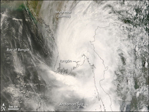 美國“今日宇宙”(universetoday)網(wǎng)站公布的衛(wèi)星照片顯示,強熱帶風(fēng)暴“納爾吉斯”2日開始在緬甸伊洛瓦底省;鶏u附近登陸,風(fēng)暴登陸時的最大風(fēng)力超過190公里。風(fēng)暴登陸后轉(zhuǎn)向緬甸三角洲地區(qū),一路掃蕩伊洛瓦底省、勃固省和仰光省,3日凌晨突然抵達仰光市中心。屬于第三級熱帶氣旋的“納爾吉斯”一路沿仰光西南約220公里的伊江江口登陸北上,沿途摧毀無數(shù)的建筑物。