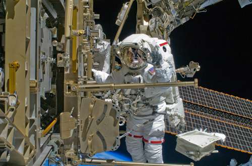 美國(guó)太空人甘保二十日?qǐng)?zhí)行任務(wù)時(shí),停下來(lái)向鏡頭揮手。(美國(guó)宇航局圖)