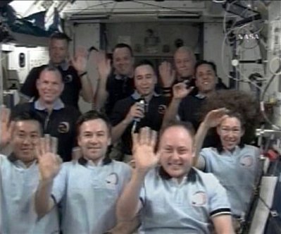 “發(fā)現(xiàn)”號(hào)航天飛機(jī)與國際空間站的宇航員在分別前合影留念。