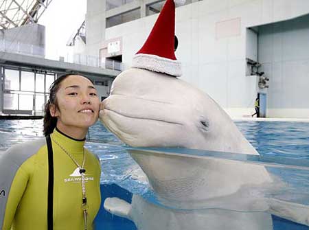 中新網(wǎng)12月19日 綜合媒體報(bào)道,由于圣誕節(jié)將至,日本橫濱八景島海洋樂園為了吸引更多的游客前來游覽亮出奇招,給館內(nèi)的兩頭白鯨戴上可愛的圣誕帽,前來游覽的游客甚至有機(jī)會(huì)得到這兩頭戴著圣誕帽的白鯨的親吻。