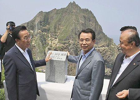 報(bào)道引述韓國(guó)“聯(lián)合新聞通訊社”指出,韓國(guó)建國(guó)六十年來(lái),首次由現(xiàn)任國(guó)務(wù)總理韓升洙登訪獨(dú)島后,鼓勵(lì)了海洋警察隊(duì)隊(duì)員和獨(dú)島居民金圣道夫婦,并在現(xiàn)場(chǎng)設(shè)置一塊長(zhǎng)三十二公分、寬二十二公分的標(biāo)石,上面刻有“東海上的韓國(guó)領(lǐng)土獨(dú)島”字樣。