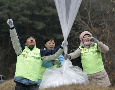 10名韓國活躍人士周四(20日)放出10個(gè)氦氣球,每個(gè)氣球掛了1萬張批評金正日的傳單。