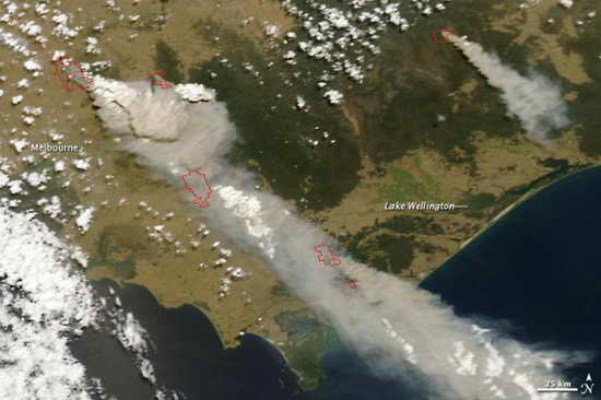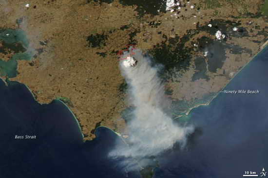 美國宇航局“阿卡”(取自拉丁文,意思是“水”。)衛(wèi)星中分辨率成像光譜儀所拍攝到的衛(wèi)星圖片反映了澳大利亞維多利亞州2月7日的山火情況,維多利亞州有多處發(fā)生山火(用紅色標出)。由于受到大風(fēng)的影響,大團煙霧正向東南方擴散。澳大利亞東北部的內(nèi)陸沙漠正在刮沙塵暴。新聞報道稱,這些山火是在數(shù)小時內(nèi)出現(xiàn)并快速蔓延的。