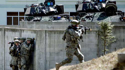 中新網(wǎng)3月11日電 據(jù)韓國《中央日報》報道,10日是韓美“關(guān)鍵決斷(key resolve)”聯(lián)合軍事演習(xí)的第二天,京畿道抱川駐韓美軍羅德里格斯(Rodriguez)射擊場上,韓美海軍展開巷戰(zhàn)訓(xùn)練。美軍士兵正朝著假想敵軍占領(lǐng)的建筑物前進(jìn)。