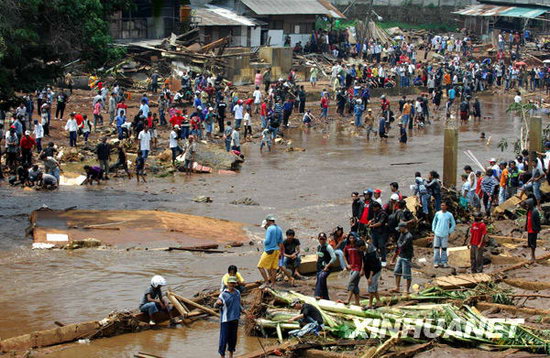 當?shù)貢r間27日凌晨2時許,在距雅加達以南約50公里的文登縣發(fā)生湖壩決堤事故。古農湖大壩突然崩塌,洪水隨即沖入居民區(qū),水深最高達2.5米,許多居民在睡夢中被大水卷走。(新華網(wǎng)雅加達3月29日電/記者趙金川)