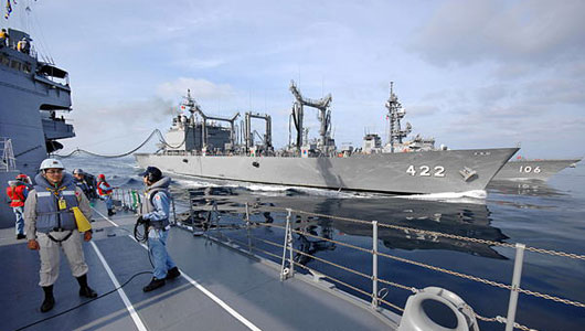 兩艘護衛(wèi)艦14日從日本廣島縣吳基地出發(fā),28日曾接受依據(jù)新《反恐特措法》在印度洋執(zhí)行任務的海上自衛(wèi)隊補給艦的供油。