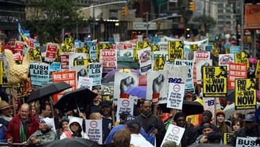 紐約的示威者進行了2分鐘默禱,紀(jì)念2003年伊拉克戰(zhàn)爭的亡魂。約各有上萬人參加了在芝加哥和舊金山的反戰(zhàn)示威。