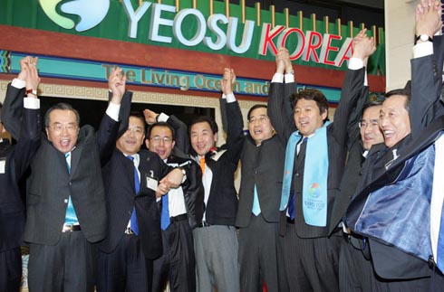 進(jìn)入大會場的韓國代表團(tuán)接到成功申博的消息后,在大會場旁邊焦心等待的申博團(tuán)和助威團(tuán)等600多人一齊高喊“萬歲”,慶祝麗水成功申辦世界博覽會。