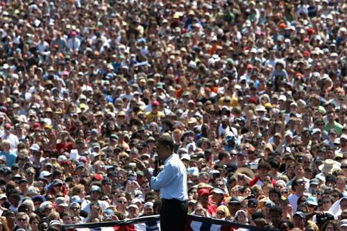 美國民主黨總統(tǒng)競選人奧巴馬十八日在俄勒岡州對民眾演講。