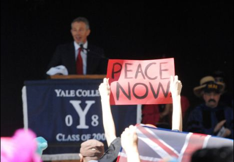 布萊爾在抵達耶魯大學(xué)遇到了一小群示威者,他們揮動著寫有“對布萊爾說不”、“耶魯!不要支持一名戰(zhàn)犯”的標(biāo)語牌,警方?jīng)]有讓這些示威者進入講演會場。講演是在一個有門的大花園內(nèi)進行的。但當(dāng)54歲的布萊爾走上主席臺時,一些學(xué)生展示了紅色的標(biāo)語,上面寫著“現(xiàn)在就實現(xiàn)和平”、“不要戰(zhàn)爭”。學(xué)生是將這些標(biāo)語放在畢業(yè)袍里帶進會場的。一名戴著頭巾的女學(xué)生在布萊爾講演時一直站著,她在距布萊爾約3米遠的地方舉著“現(xiàn)在就要和平”的標(biāo)語。布萊爾看起來非常努力地不去看那名女學(xué)生。布萊爾在講演時也未直接提到伊拉克,他在講演時談到了氣候變化的問題、由宗教加劇的恐怖主義。布萊爾將于明年在耶魯大學(xué)開信仰和全球化課程。