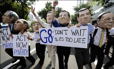 中新網(wǎng)7月6日電 八國(guó)集團(tuán)首腦峰會(huì)7日起一連3日在日本北海道洞爺湖舉行。由國(guó)內(nèi)外活躍分子、公民組織成員、非政府組織成員組成的數(shù)千示威者5日在札幌游行,高叫“我們抗議富國(guó)召開峰會(huì)”。國(guó)際樂(lè)施會(huì)成員沿用慣常的諷刺手法,裝扮成日本首相福田康夫、美國(guó)總統(tǒng)布什等八國(guó)領(lǐng)導(dǎo)人,穿著和服合唱卡拉OK版的Abba樂(lè)隊(duì)名曲《Money, Money, Money》。