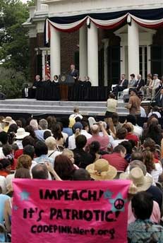 據(jù)香港《文匯報》等媒體報道,布什在第3任總統(tǒng)兼《獨(dú)立宣言》起草人杰斐遜在弗州夏洛茨維爾的故居發(fā)表為時僅有10分鐘的演說,期間至少9名示威者被押送離開。有示威者呼喊“彈劾布什!”又有示威者罵他“戰(zhàn)犯”。