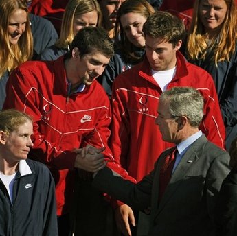 和菲爾普斯握手時,布什的臉色顯得很難看。