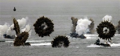 韓國艦艇正在閱兵式上進(jìn)行表演。