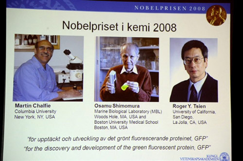 中新網(wǎng)10月8日電 綜合報(bào)道,瑞典皇家科學(xué)院諾貝爾獎(jiǎng)委員會(huì)于當(dāng)?shù)貢r(shí)間10月8日11時(shí)45分左右(北京時(shí)間10月8日17時(shí)45分左右)宣布,將2008年度諾貝爾化學(xué)獎(jiǎng)授予美國(guó)日裔科學(xué)家下村修(Osamu Shimomura)、美國(guó)科學(xué)家馬丁·查爾菲(Martin Chalfie),以及美國(guó)華裔科學(xué)家錢永健。他們?nèi)嗽诎l(fā)現(xiàn)和研究綠色熒光蛋白(GFP)方面有突出成就。