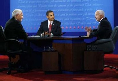 中新網(wǎng)10月16日電 綜合報(bào)道,美國(guó)共和黨總統(tǒng)候選人麥凱恩和民主黨總統(tǒng)候選人奧巴馬于美東時(shí)間15日晚上9時(shí)(北京時(shí)間16日早上9時(shí))在紐約霍夫斯特拉大學(xué)展開(kāi)總統(tǒng)選舉投票前的最后一場(chǎng)電視辯論。