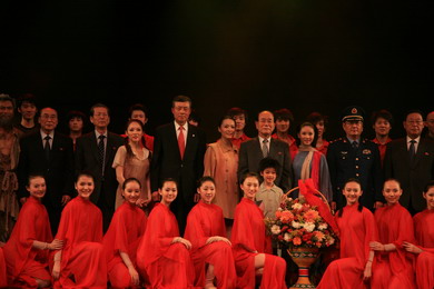 演出進(jìn)行了近2小時(shí)。出席演出的朝領(lǐng)導(dǎo)人在演出結(jié)束后與演職人員一一握手,并獻(xiàn)上花籃祝賀首場演出成功。朝鮮觀眾們?yōu)橹x幕的演員們一一報(bào)以如潮的掌聲,臺(tái)上臺(tái)下相互揮手致意,《紅梅贊》訪朝首演完美謝幕。