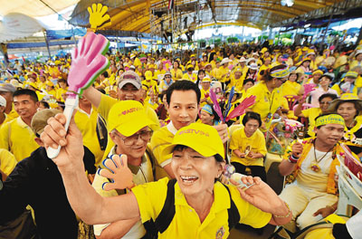 曼谷穿黃衣的反政府示威者在總理府內(nèi)發(fā)動造勢大會。