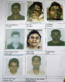 孟買警方首席調(diào)查員馬里亞向公眾展示嫌疑者的照片。馬里亞說,照片從犯罪嫌疑人尸體拍攝得來、或來自他們隨身帶著的身份證明。他說,嫌犯年齡介乎20至28歲,部分人曾化名接受訓(xùn)練。