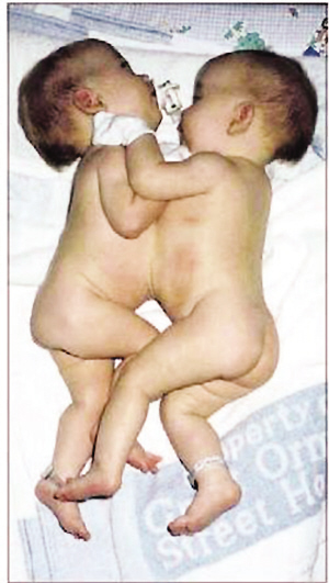 據(jù)統(tǒng)計(jì),連體雙胞胎的出生率在新生兒中僅為20萬分之一。喬安最不愿意做的一個抉擇是,在2個寶寶中選擇一個存活,同時犧牲另一個。為此她終日祈禱。1997年4月6日,喬安在曼徹斯特市的圣瑪麗醫(yī)院經(jīng)剖腹產(chǎn)生下一對連體女嬰,取名為尼芙和愛法。喬安回憶稱:“看到2個小寶寶后,我的第一反應(yīng)是她們是如此正常,僅僅是‘粘連’在一起而已。她們出生時互相擁吻著,其中一個的嘴唇緊貼著另一個,可愛極了!