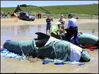 營救人員試圖救助在澳大利亞塔斯曼尼亞島上擱淺的導(dǎo)航鯨