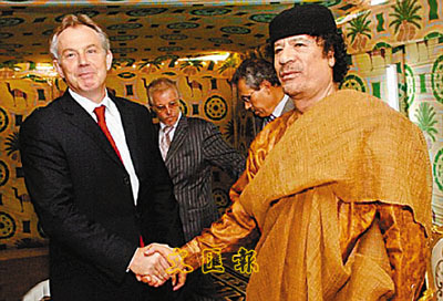 據(jù)香港《文匯報》報道,布萊爾在2004年3月到訪的黎波里,不但與利比亞領(lǐng)袖卡扎菲進行歷史會晤,雙方還達成協(xié)議,讓英國調(diào)查員到當?shù)卣{(diào)查1984年發(fā)生在英國大使館的一宗槍殺案。期間,卡扎菲把駱駝座鞍贈送給布萊爾以示友好,更象征著英國把利比亞重新帶返國際社會。